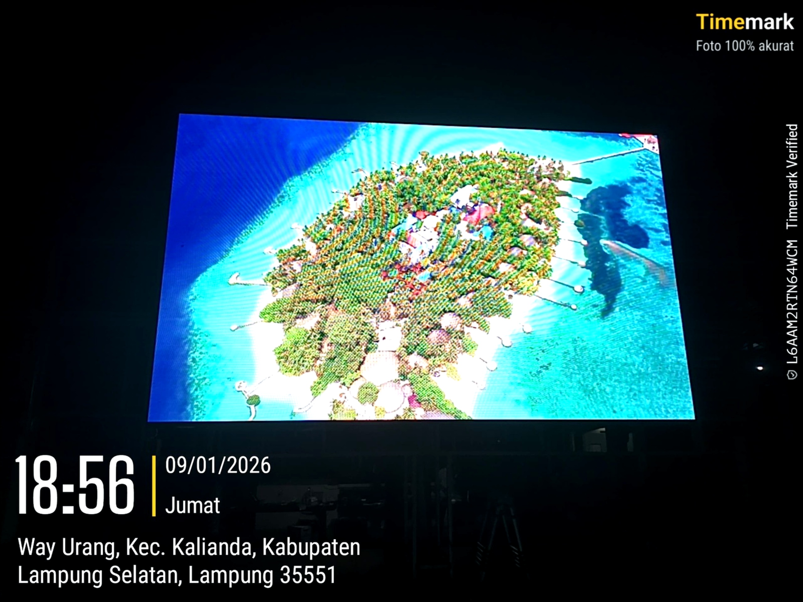 Dalam dokumentasi yang diambil pada malam hari, videotron terlihat menayangkan konten visual berupa panorama alam dengan detail yang jelas dan warna yang hidup. Hal ini menunjukkan bahwa perangkat telah terpasang dengan baik serta mampu beroperasi secara optimal.