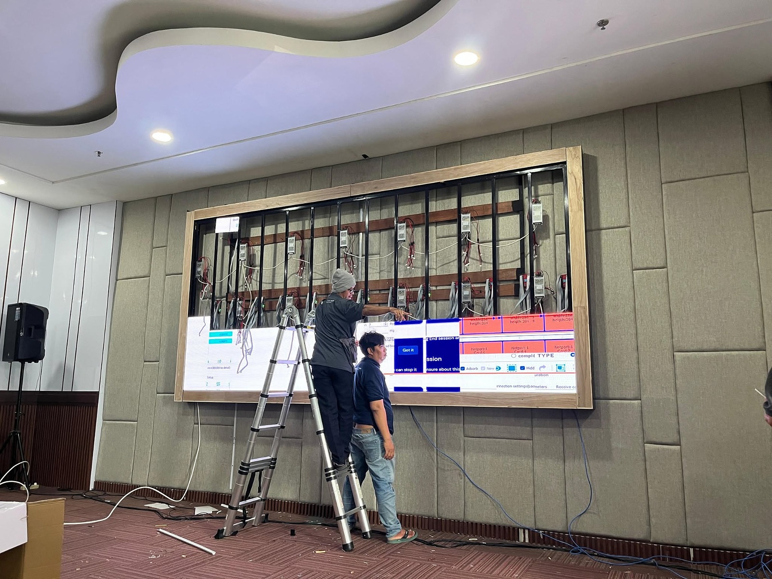 Pekerjaan ini membutuhkan ketelitian tinggi, terutama dalam memastikan setiap modul LED terpasang dengan presisi agar menghasilkan tampilan visual yang maksimal dan tidak terjadi gangguan saat digunakan. Selain itu, sistem kabel juga dirapikan untuk menghindari risiko kerusakan maupun gangguan teknis di kemudian hari.