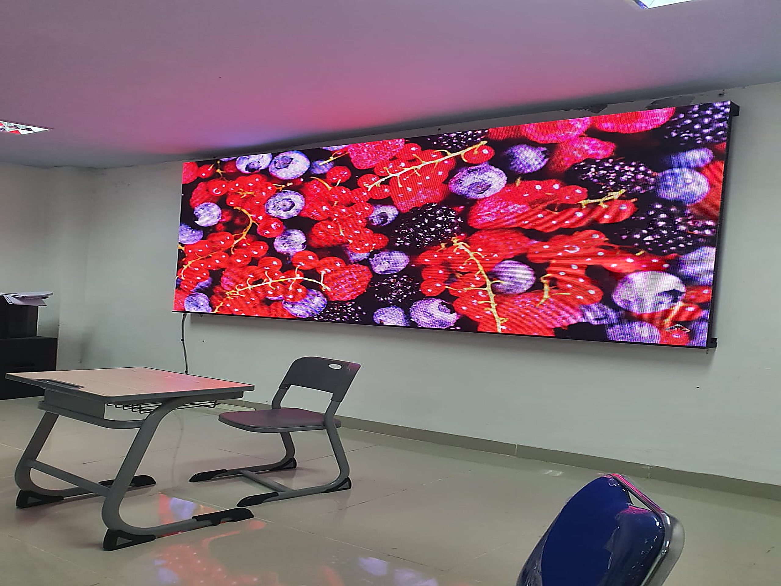 Selain digunakan sebagai media pembelajaran, layar LED ini juga dapat dimanfaatkan untuk presentasi, pemutaran video edukatif, hingga kegiatan sekolah lainnya. Dari sisi teknis, instalasi perangkat dilakukan dengan rapi dan profesional, terlihat dari penataan panel LED dan sistem kelistrikan di bagian belakang layar.
